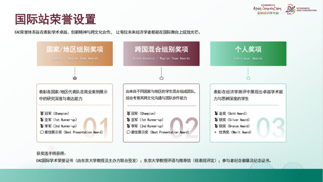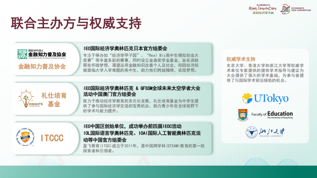 EAC亚洲经济学大会由IEO日本组委-金融知普及协会、IEO中国澳门组委-礼仕培育基金以及ITCCC(成功举办了前四届IEOC活动的IEO中国区创始单位)共同发起。这场经济学盛会获得了东京大学、香港大学等知名学术单位的专家支持。从微观经济学的供需关系到宏观经济学的政策制定,从传统行业转型到绿色金融创新,EAC为经济学爱好者提供了一个展示才华、交流思想的舞台。